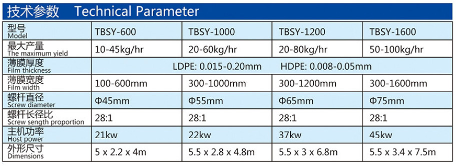 機(jī)器特性 吹制各種規(guī)格的低密度聚乙烯、高密度聚乙烯和線(xiàn)性低密度聚乙烯塑料薄膜,廣泛應(yīng)用于食品百貨、日用、化工、針紡品、購(gòu)物禮袋和工業(yè)包裝。機(jī)簡(jiǎn)、螺桿采用38CrMoAl合金材料經(jīng)氮化處理精密加工而成